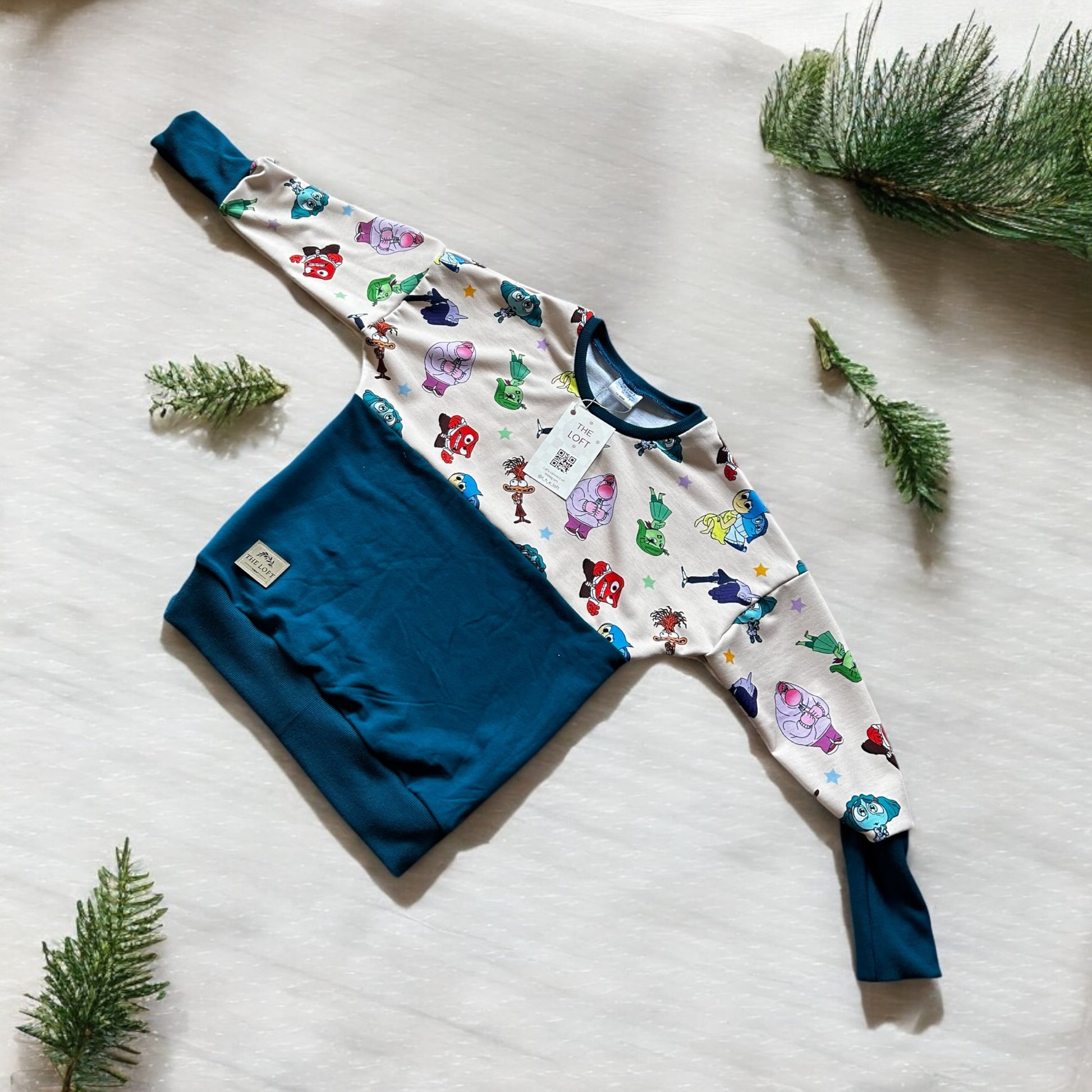 For the Inside Out fan in your life. This grow with me Crewneck sweater is designed to grow with your child and fits multiple sizes. At the low end of the size range, the sweater will have a looser fit and the cuffs will need to be folded up. As the child grows, just unfold the cuffs!